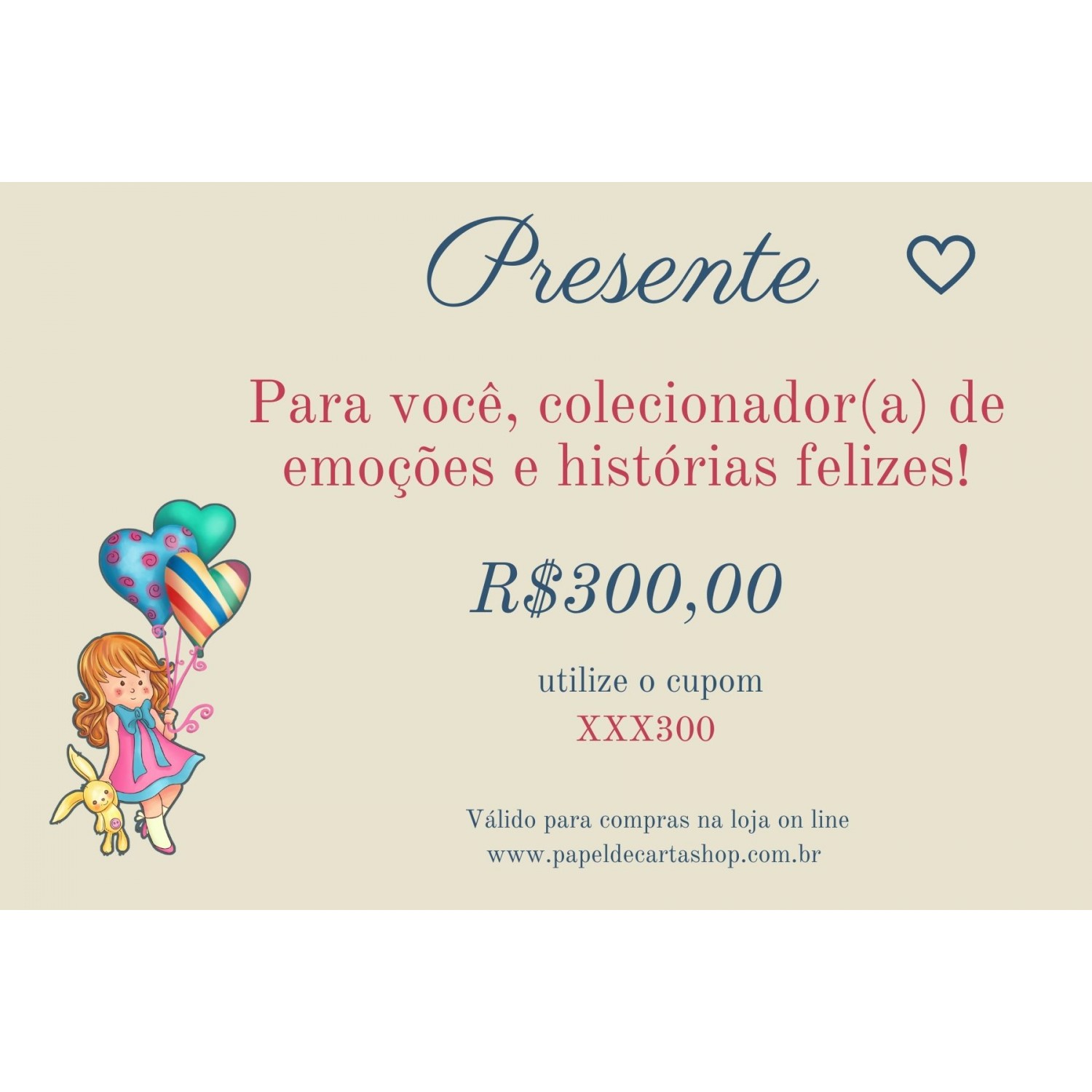 Não tenho loja física, o VALE PRESENTE deverá ser utilizado no SITE www.papeldecartashop.com.br